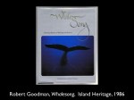 Rather than using a small independent publishing company, in Hawaii where he intended to live, Goodman set up his own company, Island Heritage. He offered Williamson a position in the company but Williamson decided to stay in Australia. Back in Hawaii Goodman eventually became more interested in book publishing than photography per se. With his friend Robert Spicer he produced a series of children’s books based on traditional folk tales in Hawaii. He became part of the renaissance of Hawaiian culture through his publishing association with the Hawaiian artist Herb Kane. After working on an early Macintosh computer to design a 1986 book about the Hawaiian whaling industry Whalesong, he became an advocate for desktop computer publishing.