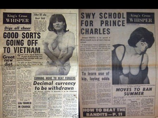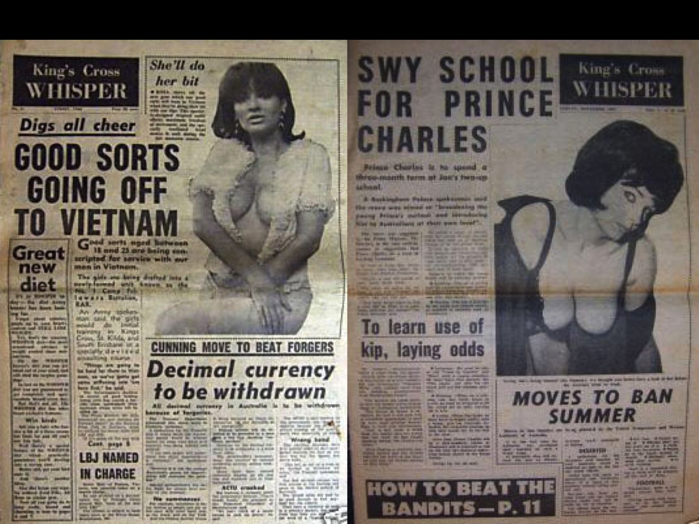 In many ways these book publishers formed a continuum with the magazine publishers, who published middle class travel magazines like Walkabout, domestically oriented magazines such as the dominant Women’s Weekly, and barbershop magazines such as Australasian Post, People or Pix. From 1965 this suburban newsagent’s range was joined by a burgeoning of inner city street magazines which focussed on satire, sex and radical politics. These included Oz, which reached a circulation of 30,000, but also magazines like Kings Cross Whisper, which reached a circulation of 100,000, and the quickly banned sex magazines like Sexy, Searchlight, Obscenity, Ribald and Censor, as well as student magazines that dealt with radical politics like Honi Soit and Tharunka.[4]