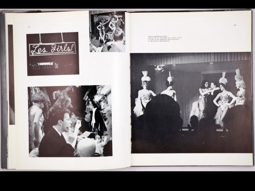 In 1965 the first book to be devoted entirely to the Cross was also published. Life at the Cross featured an anodyne text by Kenneth Slessor. Slessor had popularised ‘Bohemian Sydney’ in 1933 with his book of poems Darlinghurst Nights, and in the post war period had become the go-to laureate for poetical musings on Sydney. He was 64 by this time, and phoned in a text which is yawningly behaved. The book had an introduction by the Lord Mayor, so there is no imagery of prostitution, as there had been in The Glittering Mile, but nonetheless Robert Walker’s by now familiar imagery of ‘Parisian’ streets is spiced up with some tasteful strip club imagery, and even some drag act imagery. But all the stripper photographs are printed very small, and visually recuperated into images of suburbanites having a touristic fun night out, which are printed larger and dominate the pages.