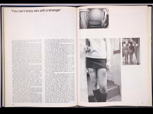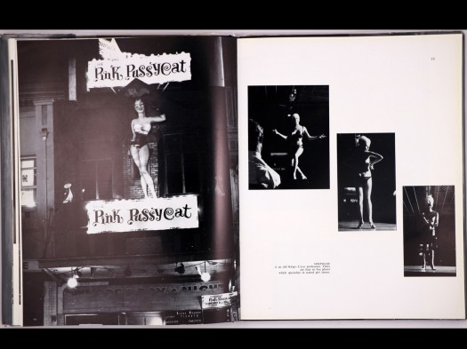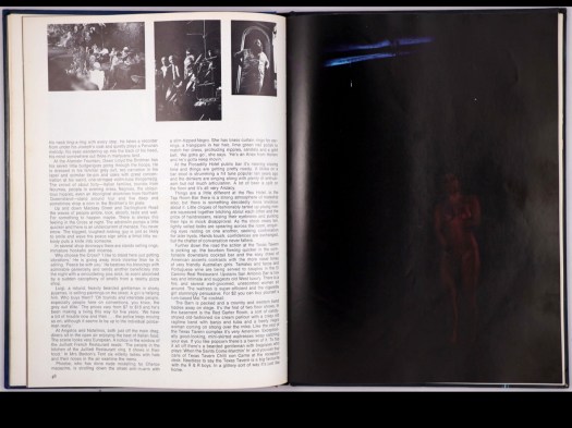 The young photographers, in their early thirties, took the reader right into the strip clubs and hippy pads of the area, using graphically dynamic and tight picture groupings and pungently personal text.[6] Their book had a decidedly hallucinogenic feel to it. Most significantly, the focal length of their lenses changed, while Robert Walker had been shooting with a something like a telephoto 135mm lens, Stacey and Ellis were shooting wide angle at 35mm. Walker’s strippers are seen from the back of the room, Stacey and Ellis take us into their dressing rooms