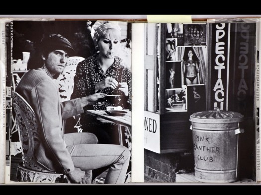 There is an obligatory excursion to the Cross in my other pick for best-Australian-photobook-ever, an acerbic take down of Australian complacency called Southern Exposure published in 1967 by Donald Horne, author of the excoriating book The Lucky Country, and the photographer David Beal. Their book which, as we can see from the cover, is dedicated to inverting Australian complacencies, also breaks down the unspoken wall between day and night which all previous visual representations of the Cross had adhered to in order to sustain the aspirational anxiety it represented — to keep separated the Cross’s twin helixes of cosmopolitanism and sleaze. In previous Cross representations the daytime is for Parisian boulevardiering, the night-time for frenetic excess. However in the double page spread of Beal’s obligatory Cross photos a fashionable young coffee drinker suspiciously glowers at the camera through narrowed eyes, wordlessly telling us to f… off, and we get a portrait of the Pink Panther’s garbage bin primly sunning itself in the bright morning.
