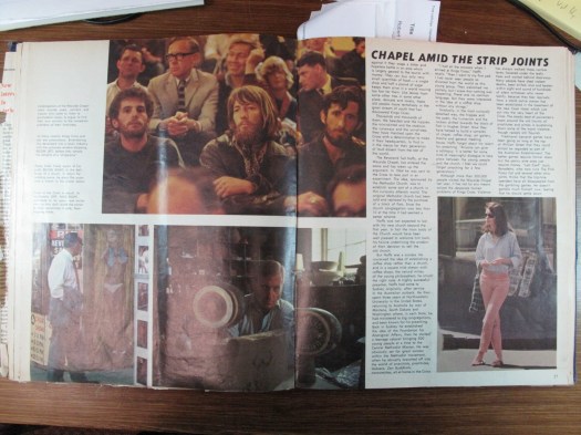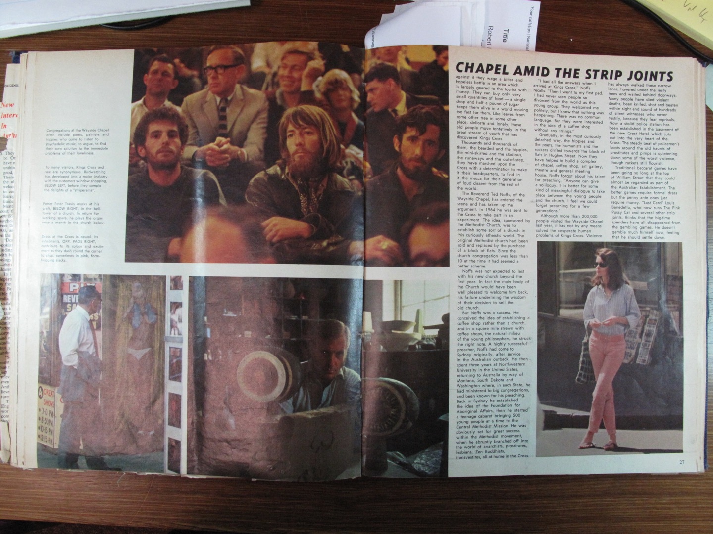 While the Cross sprouted these ecstatic visions, middle class Australia continued its fascination with it from a distance. For instance the tourist magazine Walkabout did a Cross story in 1969, adding yet another member to the cast of characters: Ted Noffs from the Wayside Chapel, which had been established in 1964 and had become a Cross institution. The following year Walkabout did yet another Cross story, this one by Wesley Stacey and Rennie Ellis and called ‘Wild Night in Big Bad Sydney’. Rennie Ellis and Wesley Stacey also contributed Kings Cross photographs to The Bulletin and The Sydney Telegraph.