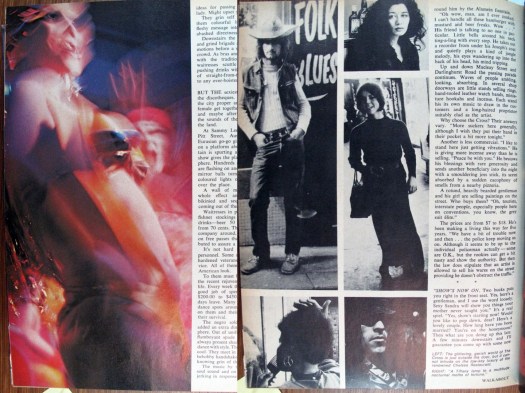 Keep your eyes and your mind wide open and you’ll see it all— the passing parade, a perennial Mardi Gras with no threat of Lent to follow. Across the road—hare krishna hare krishna krishna krishna hare hare hare—there are eight of them, the men with shaven heads, except for a tuft on the crown, the girls pretty and gentle with long plaits over their shoulders, all in flowing robes, their foreheads symbolically marked in white. Together they sway from foot to foot, a devoted chorus line of the Hare Krishna movement chanting their mantra to a drum beat and a hand clap— hare krishna hare krishna—it’s an infectious rhythm and people stop to stare, and wait for something to happen, while others join in and chant. Some hurry past as if it wasn’t really happening at all. Several Japanese businessmen leave a restaurant and climb into a long chauffeur driven car. They glance momentarily at a curvy girl in a Superman T-shirt—rama hare rama rama—while another with a gold-lettered satin sash across her shoulder walks past, handing out Whisky a Go Go invitation cards: ‘$2 includes food and drink for the sock-it-to-me happy hour and quarter and admittance all night until 3 a.m.’. People accept them indifferently. The hairy ones in their Levis are floating past, stalking shadows and followed by chunky-nippled girls in two and threes and solo, oblivious, I think, to the heads they turn. One girl in a crocheted top actually has her brown nub poking through the open knit like it’s coming up for air. You try not to look too hard and glance at the Back to Godhead magazine which you have been given—hare krishna, hare krishna—and before you’ve recovered another nymphet comes into view, beautiful and blonde, her stomach bare, her friend a willowy black soul brother bebopping along just like he was on 125th Street. Then, revving big Trummpies, a couple of Very Heavy bikies glide past, their leathered and crash-hatted ladies hunched on the back, defying the world. There are tourists in bermuda shorts with sunglasses and Instamatics and snappy little hats and next to me this jet-set guy with film star good looks and tinted hair, and his girl chain-smoking her unbelievable mauve cigarettes, and back in the street the ubiquitous little old Cross ladies tottering along all dressed up under ritzy white summer hats. And there goes Caddy, that white haired leprechaun with the side levers who carries the strippers’ bags and knows all their little secrets. Girls for a private show? Go see Caddy—hare hare rama hare—Hey man! Leonie, Jill of all trades, master of the quick con and sweet, sweet lady, mouths greetings, her snakey tatoo showing an inch above the neckline of her black satin shirt. Kerry the dog girl is shopping, and the Black Prince, with lovely young Veronica, is off downtown to flog his silver roach clips. Pilly the Dill and Fearless Fred the Drug Squad stalwarts cruise past, eyes piercing the crowded streets; Michael and Roger—Mimi and Ruth— triss by on their way to their favourite camping spot, and a thousand other people go about their daily shopping. On Thursday afternoon the scene will be the same but different, if you know what I mean. p30