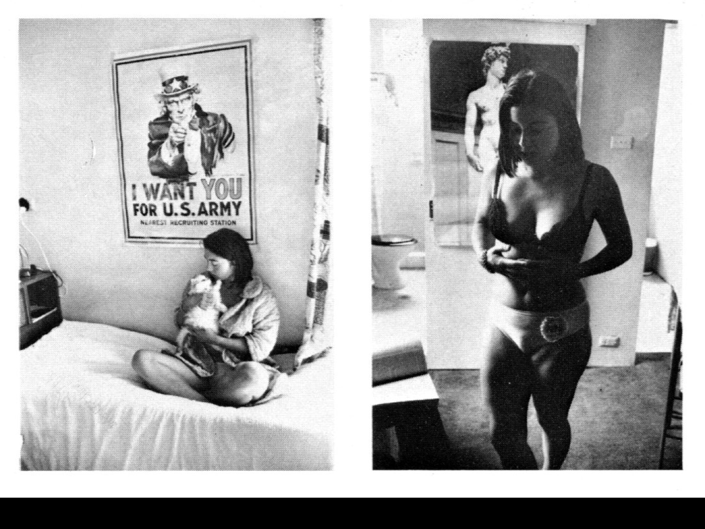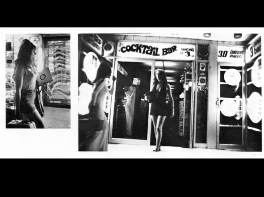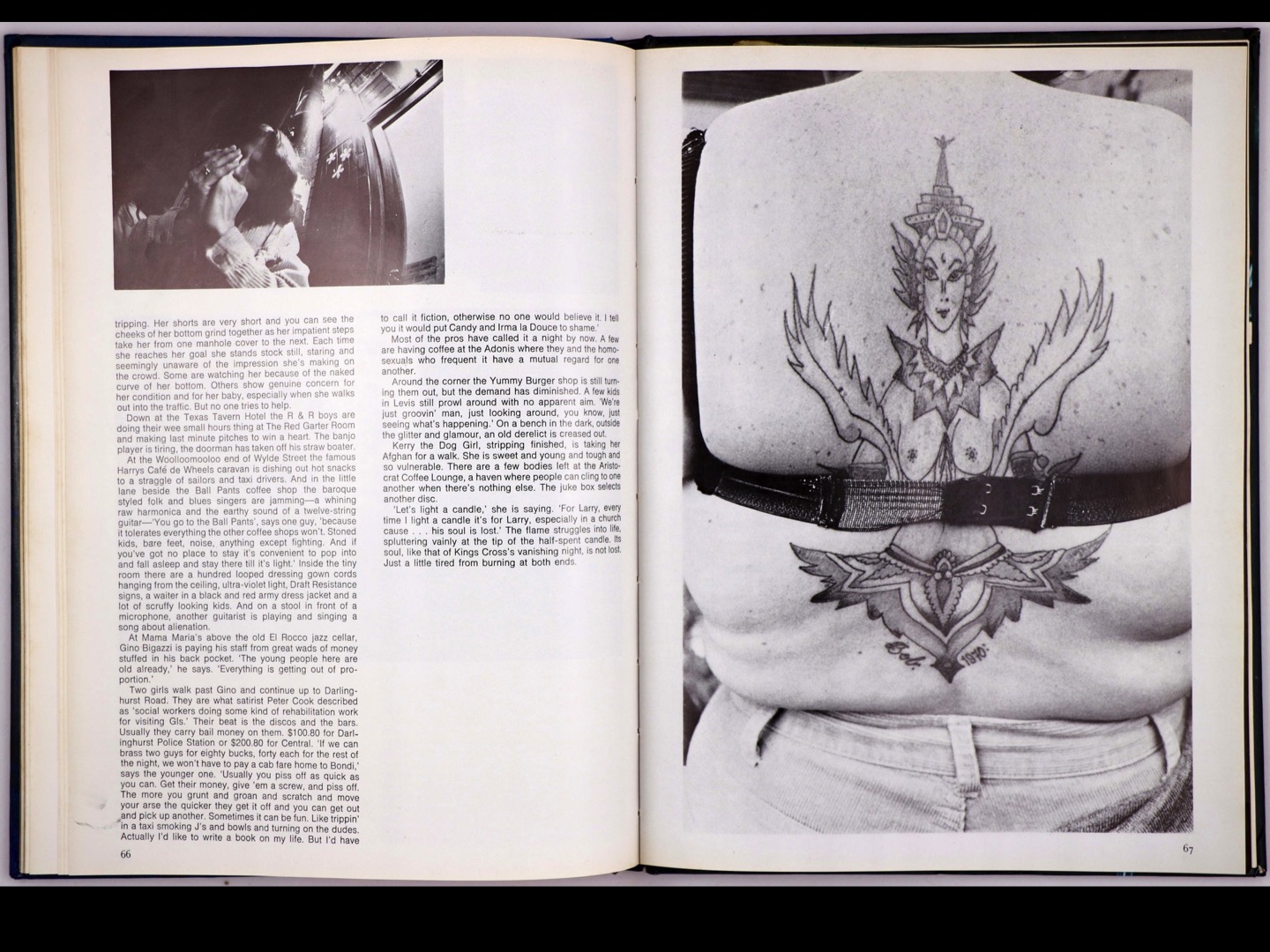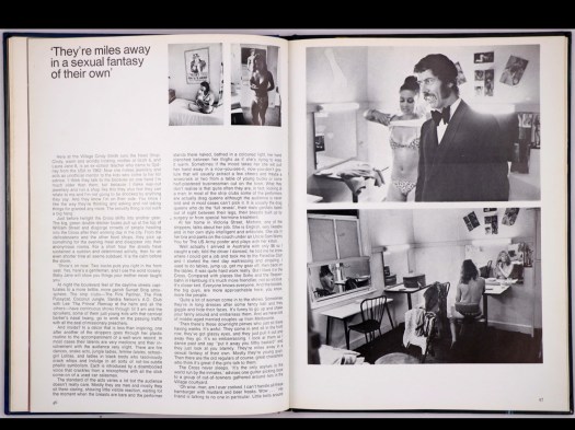 At her home in Victoria Street, Michele, one of the strippers, talks about her job. She is English, very likeable and in her own style intelligent and articulate. She sits in her bra and pants on the couch under an Uncle Sam Wants You for The US Army poster and plays with her kitten. ‘Well actually I arrived in Australia with only $6 so I caught a cab, told the driver I danced, he told me he knew where I could get a job and took me to the Paradise Club and I started the next day waitressing and stripping. I used to do tables, jump up, get my gear off, then back on the tables. It was quite hard work really. But I liked it in the Cross. Compared with places like Soho and the Reeper-bahn in Hamburg it’s much more friendlier, not so vicious. It’s closer knit. Everyone knows everyone. And the bosses, the big guys, are more approachable here, you know, more like people. ‘Quite a lot of women come in to the shows. Sometimes they’re in long dresses after some fancy ball and they giggle and hide their faces. It’s funny to go up and shake your fanny around and embarrass them. And we have lots of middle-aged married couples up from Melbourne. Then there’s these downright perves who just sit there having wanks. It’s awful. They come in and sit in the front row, they’ve got glassy eyes, and they just pull it out and away they go. It’s so embarrassing. I look at them as I dance past and say “put it away you filthy bastard” and they just look at you blankly. They’re miles away in a sexual fantasy of their own. Mostly they’re young guys. Then there are the old regulars of course, great characters who think it’s great if the girls talk to them.’