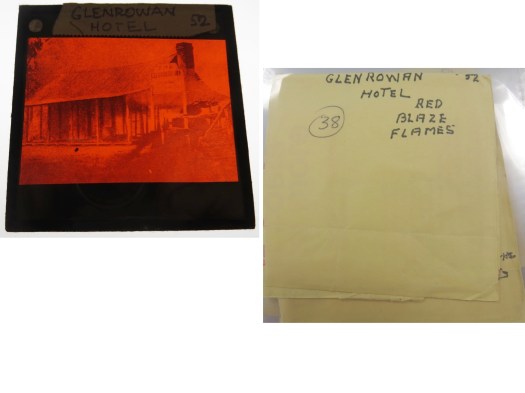 The images in the slides themselves aren’t rare, most of them were frequently reproduced as the Kelly myth grew and grew. But what is of interest is the unknown person who assembled them in the 1940s. Whoever they were, this amateur iconologist was obviously a bushranger buff preparing a show, perhaps for a public lecture at an historical society, or perhaps just for their family of friends. They have made the lantern-slides by copying the huge array of bushranger imagery already circulating through contemporary sources. Each slide has been extensively labelled and relabelled, and each has been placed into its own sleeve improvised out of old bank deposit envelopes. Perhaps our lanternist had a personal interest in Kelly’s crimes, perhaps he was a bank teller by day and a bushranger buff by night? In the spidery handwriting of an aged person captions and prompting words for a live commentary have been added to the envelopes, such as RED BLAZE FLAMES, for a slide of Glenrowan pub on fire. This slide has also been hand coloured, so the burning of the Glenrowan pub, tinted red in Australia’s first feature film, is tinted red again in this lantern slide. Other images come straight from the siege. For instance the set contains the famous image by J W Lindt of the body of Joe Byrne strung up an a door. However, this image was copied out of a book, perhaps Julian Ashton’s autobiography published in the 1941.