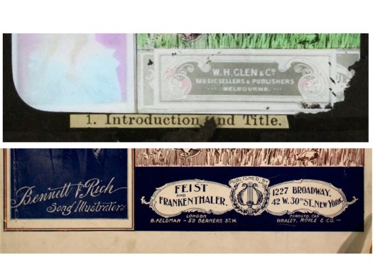 However in the set shown in Australia, tiny rectangles of black tape has been used to modify the opening slide, which is a photographic reproduction of the cover of the sheet music. The identity of the American song illustrators has been erased, and the original Tin Pan Alley music publisher has been replaced with a Melbourne sheet music retailer. In addition, tape has been used to cover the words “A sympathetic song from life” at the top edge of the slide. We see in this example physical evidence of competition between emerging global territories for technologized content, which is so much part of our contemporary media environment.