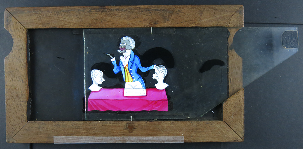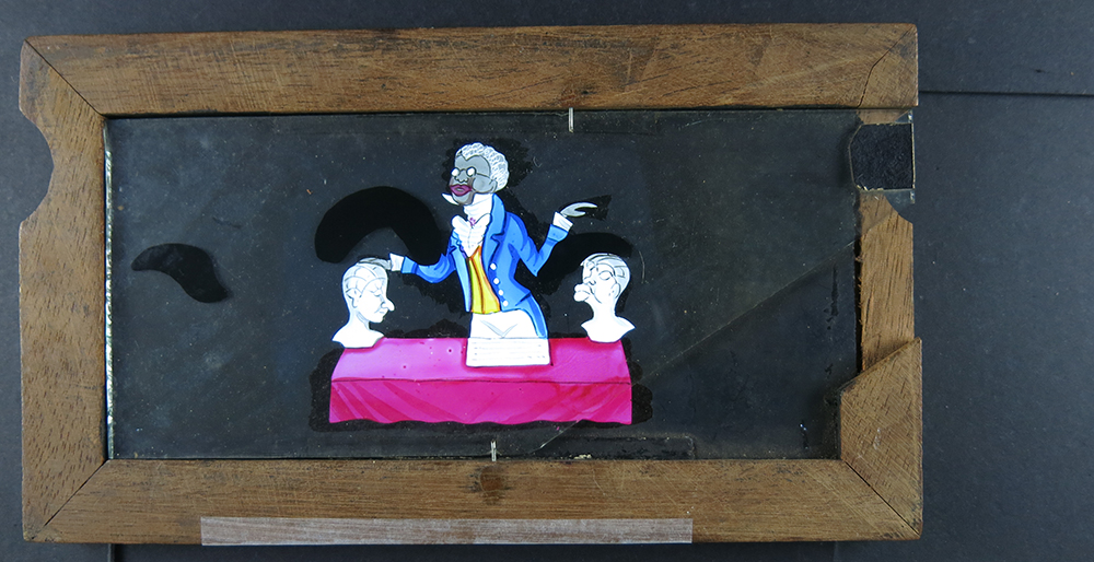 By far the most popular magic lantern slide of the nineteenth century was ‘Man Eating Rats’. Lanternists would even specifically promise it in their newspaper advertisements, so audiences knew they could go along and enjoy themselves making the requisite snoring and chomping and lip-smacking noises. I’ve had a copy of the slide for a while. But while the circulating rackwork rats worked perfectly, the sleeping man’s gluttonously bearded jaw was missing. Fortunately the ANU School of Art has a wealth of skill and knowledge and Waratah Lahy was able to paint me a beautiful new jaw and beard (on a replacement piece of polycarbonate) which works perfectly. I’ll be showing it this Friday evening at the National Portrait Gallery in Canberra. I’ve also just brought a slipping slide of a phrenologist alternately examining a head of a ‘low’ type and a head of a ‘high’ type. Once again Australian National University historical expertise, through my colleague Alexandra Roginski, was able to provide me with actual phrenological readings from the period. So we’ll be performing this slide as well. There’ll be heaps of other slides, including The Gin Fiend.