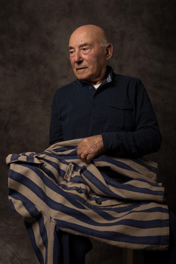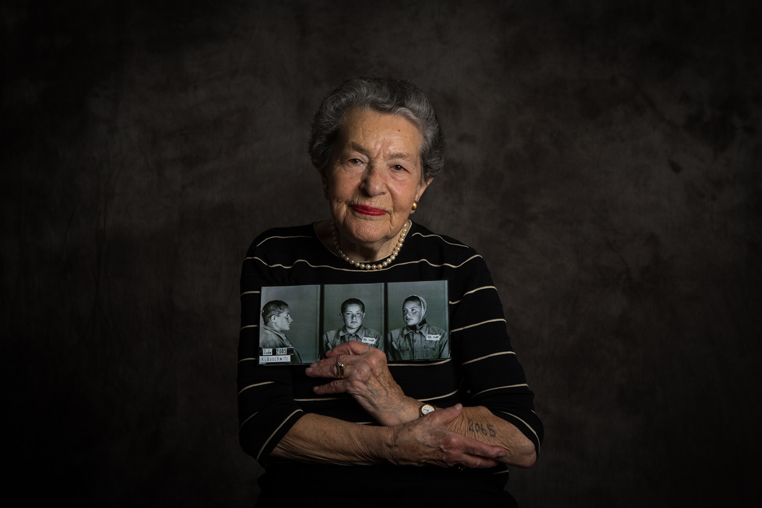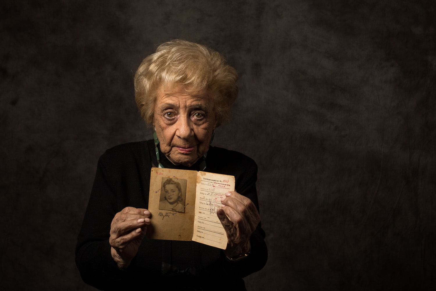George Gronjowski holds up his concentration camp tunic for us to see, but his red-rimmed eyes are looking off into the past. This faraway look is also in the eyes of John Gruschka as he fans out, between the parchment-like skin of his fingers, the desiccated pages of the letters his mother wrote to him from Prague, as he sheltered in England, before her murder in Auschwitz. Joe Symon stares frankly ahead as he confidently flips up for us a photograph of his fifteen year old self, while Lotte Weiss, wearing her hair done elegantly in a salon, freshly applied lipstick, golden earrings, pearls, and a warm, open expression, holds her shaven-headed mug shots from Auschwitz across her chest while matter-of-factly displaying the identification number tattooed on her arm.