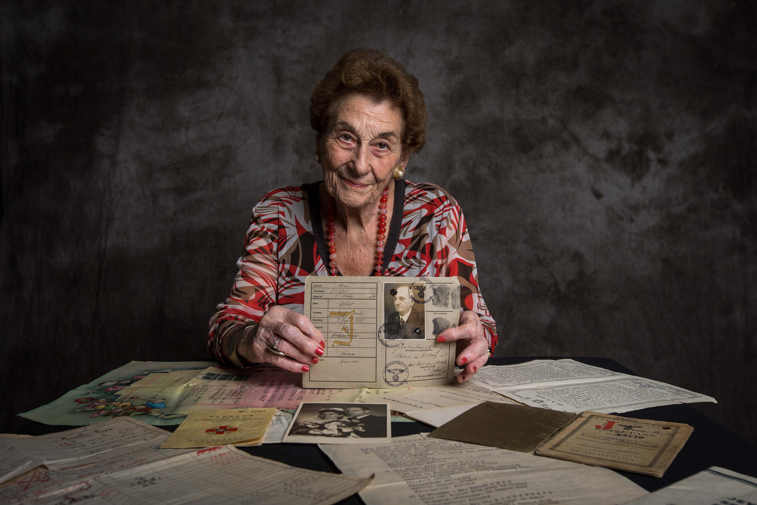 Eddie Jaku delicately uncurls a thin, crumbling leather belt — the belt he wore through four prison camps — as though it was a timorous animal curled up in his hands. The viewer’s sense of the texture of the belt’s splitting tongue against his fingers, and the weight of its buckle on his palm, powerfully reconstitute the experiences he endured and the now absent trousers the belt once held up. Egon Sonnenschein looks directly into our eyes as he holds out to us a postcard whose surface is covered with the coloured marks and inscriptions of its ricocheting around Europe. The wings of this ephemeral butterfly appear to have been delicately caught in mid-flight by the tips of his fingers.