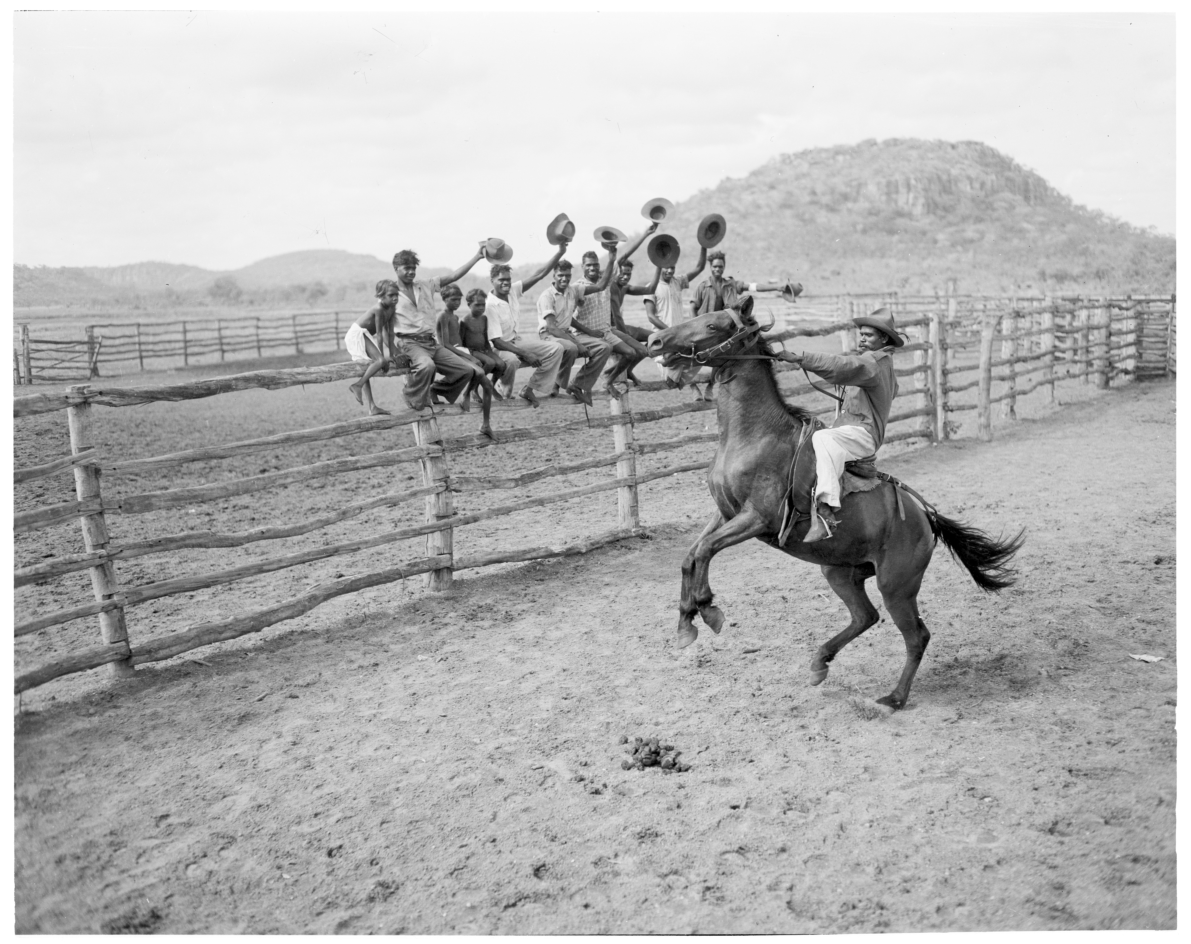 In another slightly stilted Bill Brindle photograph, staged at the Oenpelli (Gunbalanya) mission in the Northern Territory, a line of young Aboriginal men along a stockyard railing have been told to cheer on an older Aboriginal stockman who is breaking in a horse for the camera. Brindle had to use two sheets of large-format film to get the right combination of rearing horse and line of waving hats. But despite this careful choreography it is the three young Aboriginal kids at the end of the row, who don’t yet have hats to wave and wrap their legs around the top rail in squirming apprehension, who most engage our attention.