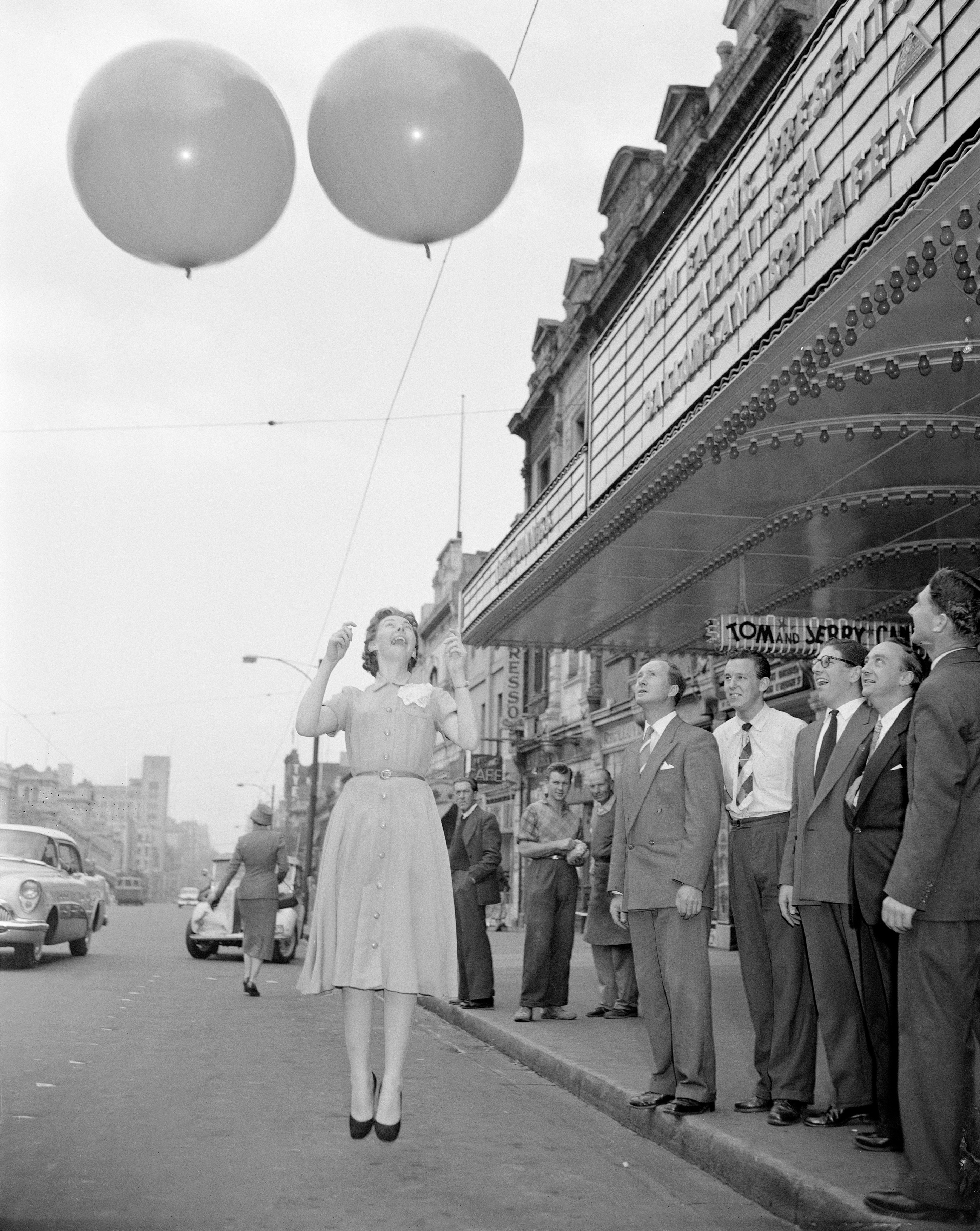 Posing with weather balloons outside the St James Theatre & Metro on Bourke Street to promote the screening the Australian Commonwealth Film Unit and Bureau of Meteorology documentary, Balloons and spinifex, Melbourne 1958. Photographer Wilfred Brindle. NAA: A1200, L26100