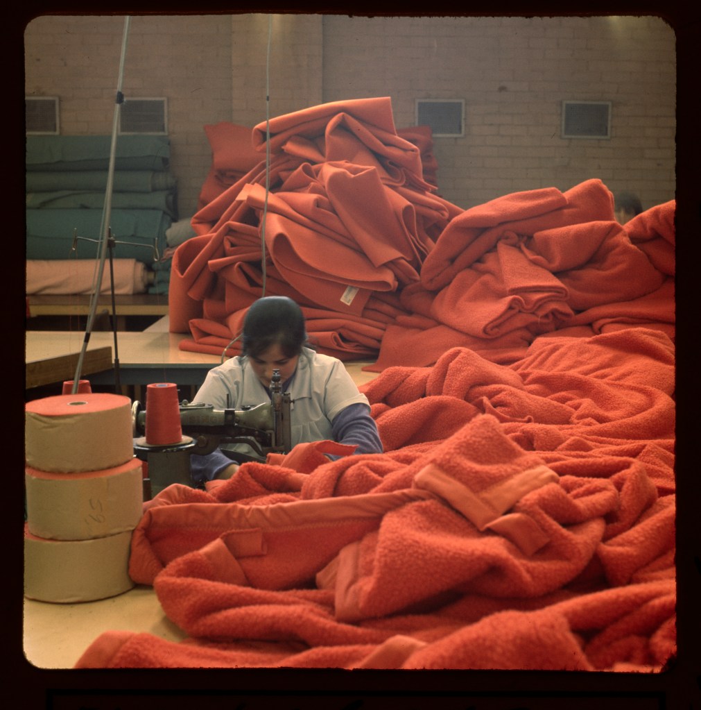 Sometimes the photographer themselves seems to subvert their own publicity message. For instance, all the men posed studiously checking on quality control in Eric Wadsworth’s various factories, from a Toyota car parts factory in Altona, Victoria, to a Prestige stocking factory in Brunswick, Melbourne, seem to be ‘on message’ – in authoritative command of the industrial process. But our hearts go out to the poor worker woman, bent over her machine, sewing the massive thick orange blankets that are beginning to engulf her at the James Miller carpet factory, Warragul, Victoria, in 1971.