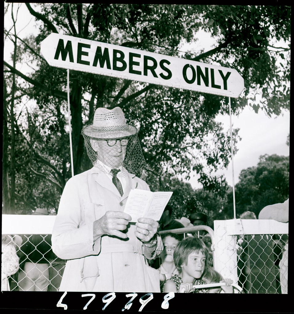 Veteran punter outsmarts flies in the Members area at the Balnarring Picnic Races, Victoria 1969. Photographer Keith Byron. NAA: A1200, L79798