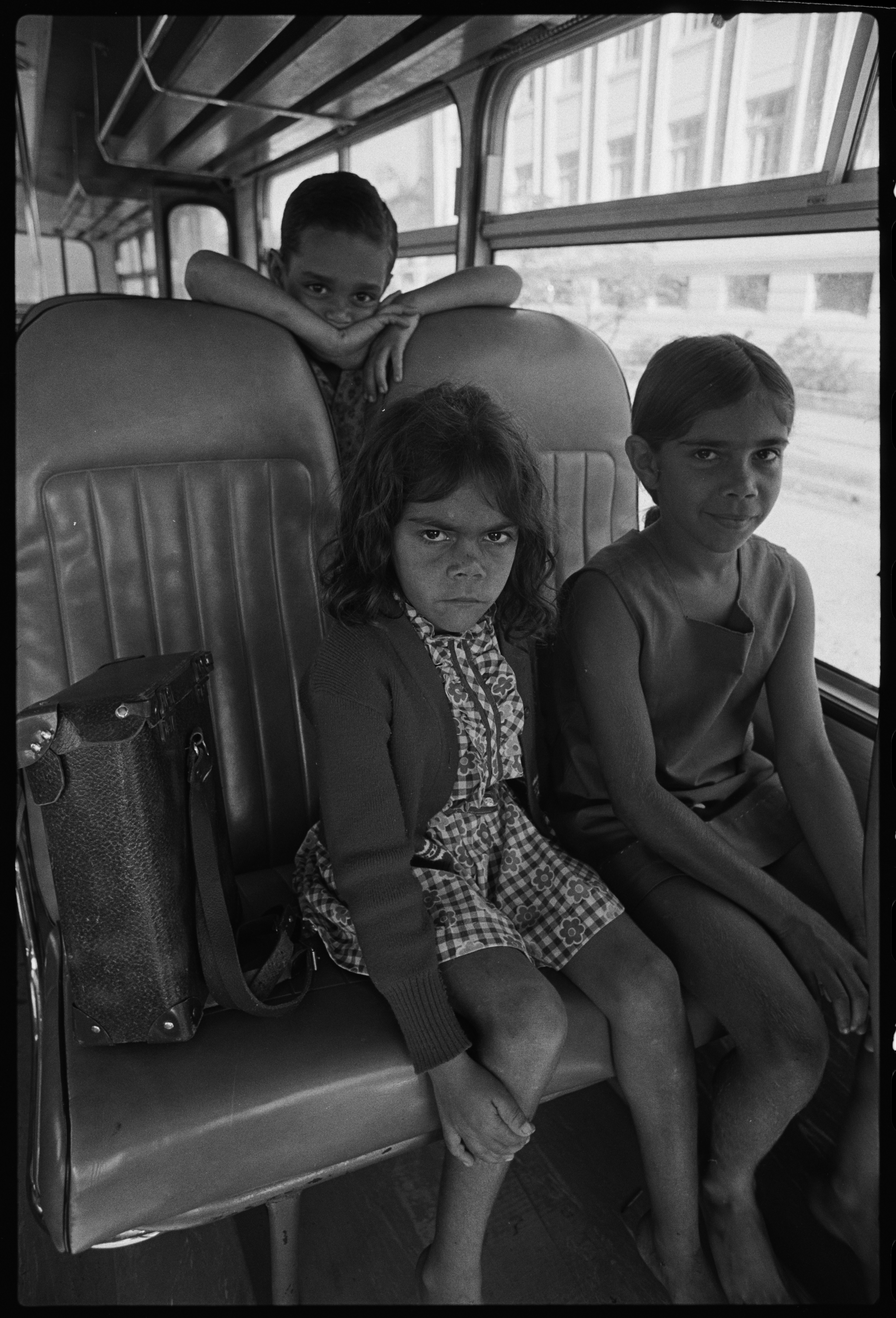 Staring down the photographer on a bus, Yarrabah, Queensland 1974. Photographer Mervyn Bishop. NAA: A8739, A26/8/74/25