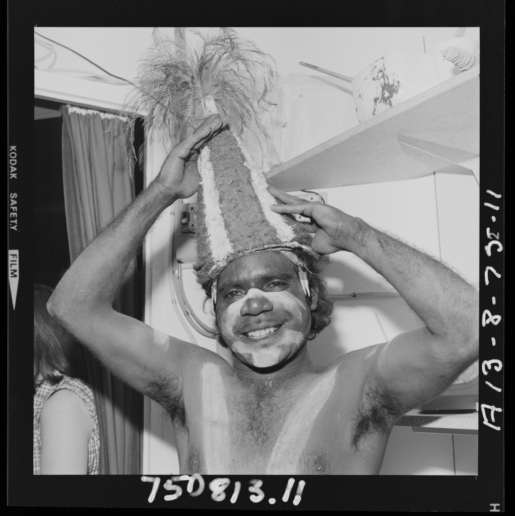 Mornington Island dancer sharing Lardil culture with audiences at the Brisbane Exhibition, 1975. Photographer Mervyn Bishop. NAA: A8739, A13/8/75/11