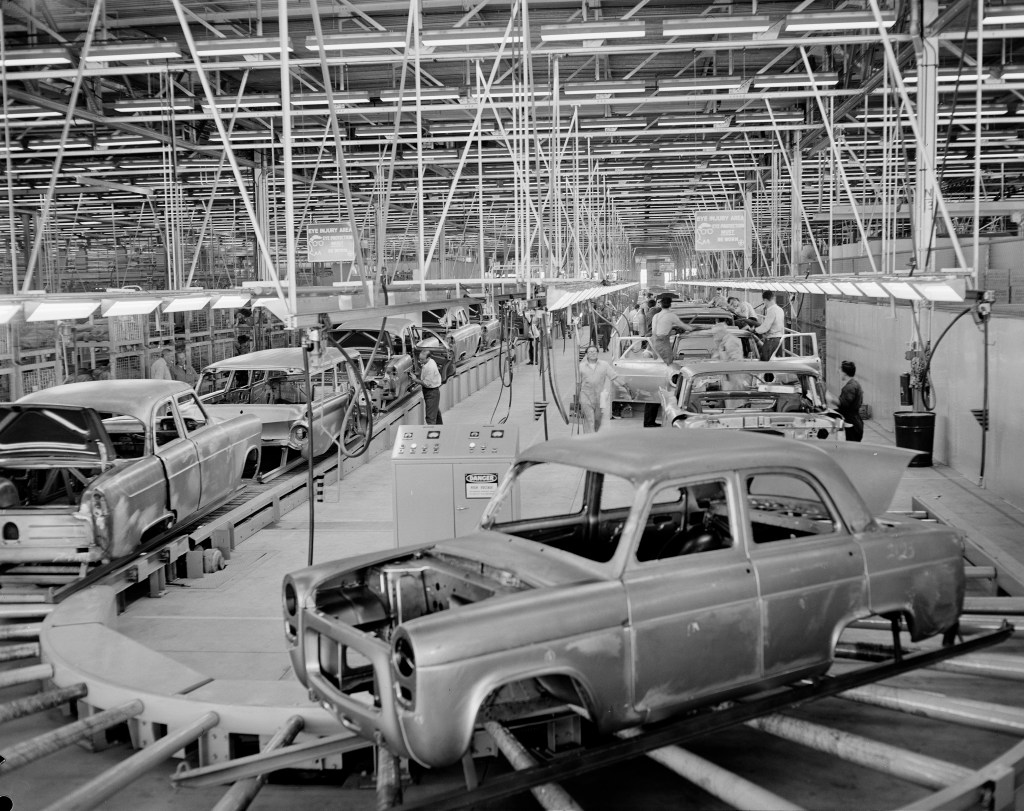 Cars move along the 4-kilometre assembly line at the Ford Motor Company, Broadmeadows, Victoria 1960. Photographer Neil Murray. NAA: A1200, L34225
