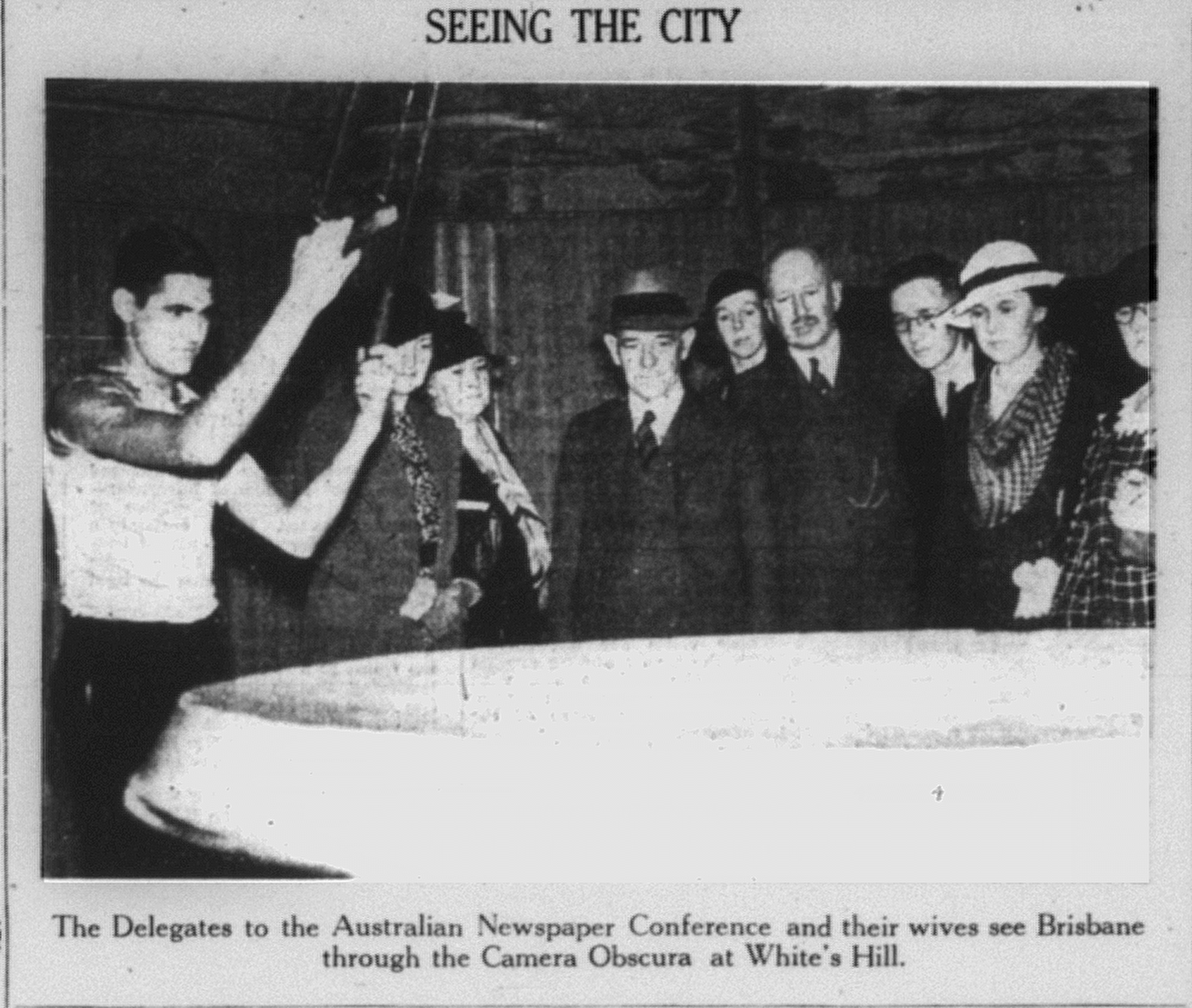 ‘Seeing the City, The Delegates to the Australian Newspaper Conference and their wives see Brisbane through the Camera Obscura at White’s Hill’, The Telegraph, 1 June 1935 p13.