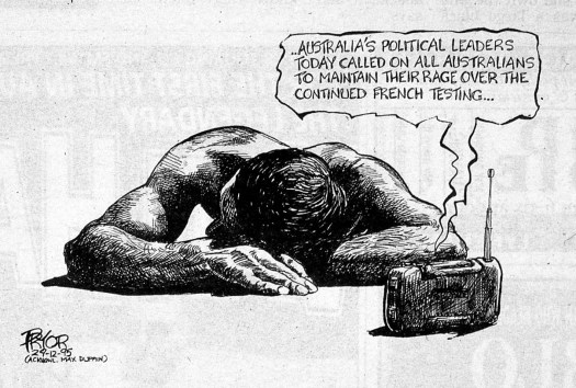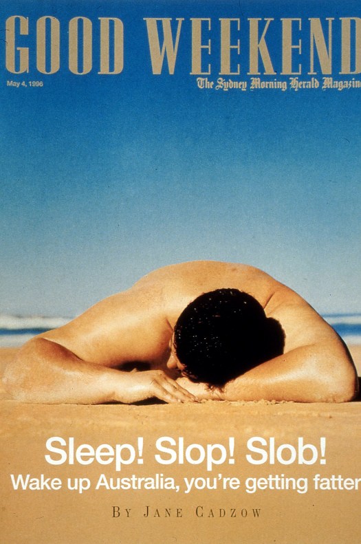 Parodists pounced on the Sunbaker to exploit the incipient ambiguities of his state of mind, which could become a stand-in for the national state of mind. As he claims the beach for himself, sucking up spiritual sustenance from the land and exposing his back to the benedictions of the Australian sun, is he poised, ready to spring into virile action, or is he experiencing the ultimate state of relaxation, in blissful post-coital communion with the beach? Or, is he in some heat-induced stupor, or asleep? In an historical coma, or dead? An example of these many parodies is the cover of the Sydney Morning Herald’s Good Weekend magazine from 1996, where an obese sunbaker snores away on the beach above the tagline ‘Sleep! Slop! Slob! Wake Up Australia, you’re getting fatter!’ Many other cartoons and photographs used the Sunbaker to comment on Australia’s high sun cancer rates, its general political torpor, its sexism where public space was ruled by men, and his persistent claim to a supposedly ‘pure’ Australian Anglo Celtism in the face of an ethnically diversifying Australia. But, for a time, all these parodies only reinforced his iconicity.